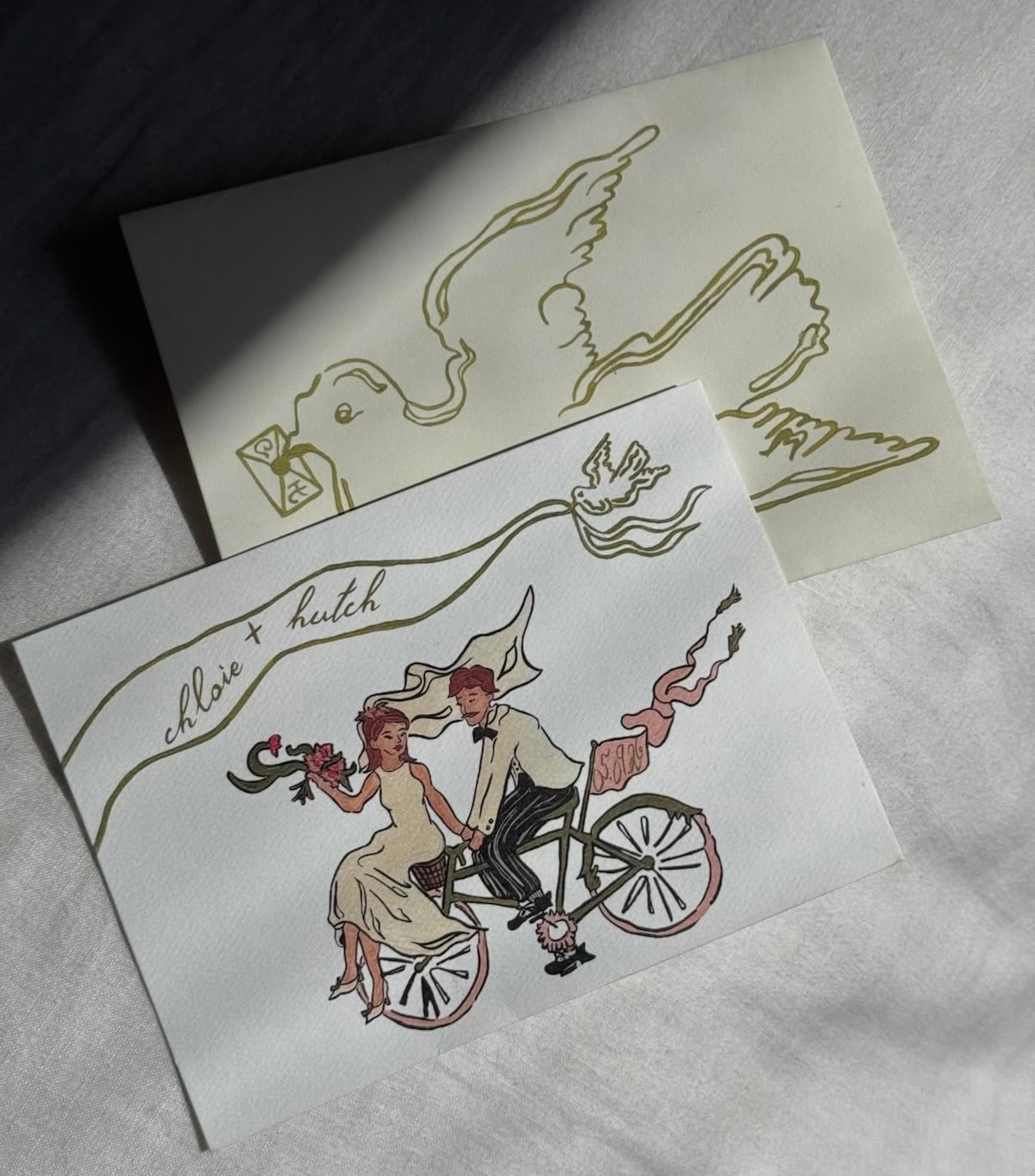 The save the dates show illustrations of Chloie and Hutch riding on a bicycle together while wearing wedding attire.
