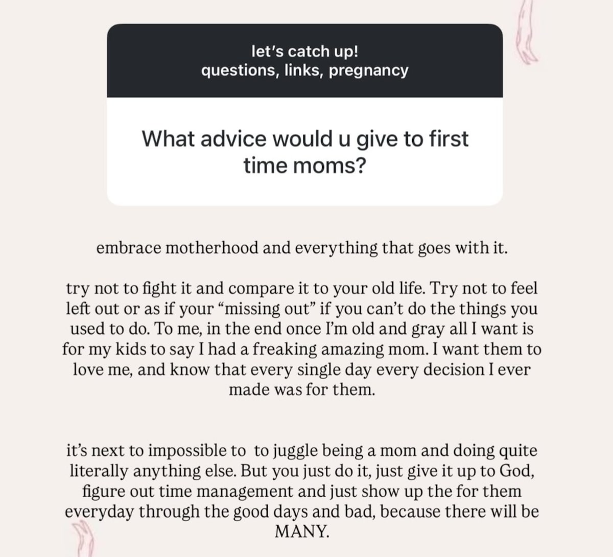 She said, “It’s next to impossible to juggle being a mom and doing quite literally anything else. But you just do it, just give it up to God, figure out time management and just show up for them every day through the good days and bad, because there will be MANY.”