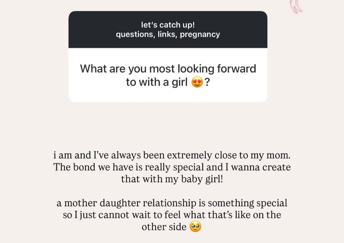 Another person then asked Sydney what she’s most looking forward to with having a girl, and she replied, “I am and I’ve always been extremely close to my mom. The bond we have is really special and I wanna create that with my baby girl! A mother daughter relationship is something special so I just cannot wait to feel what that’s like on the other side 🥹”