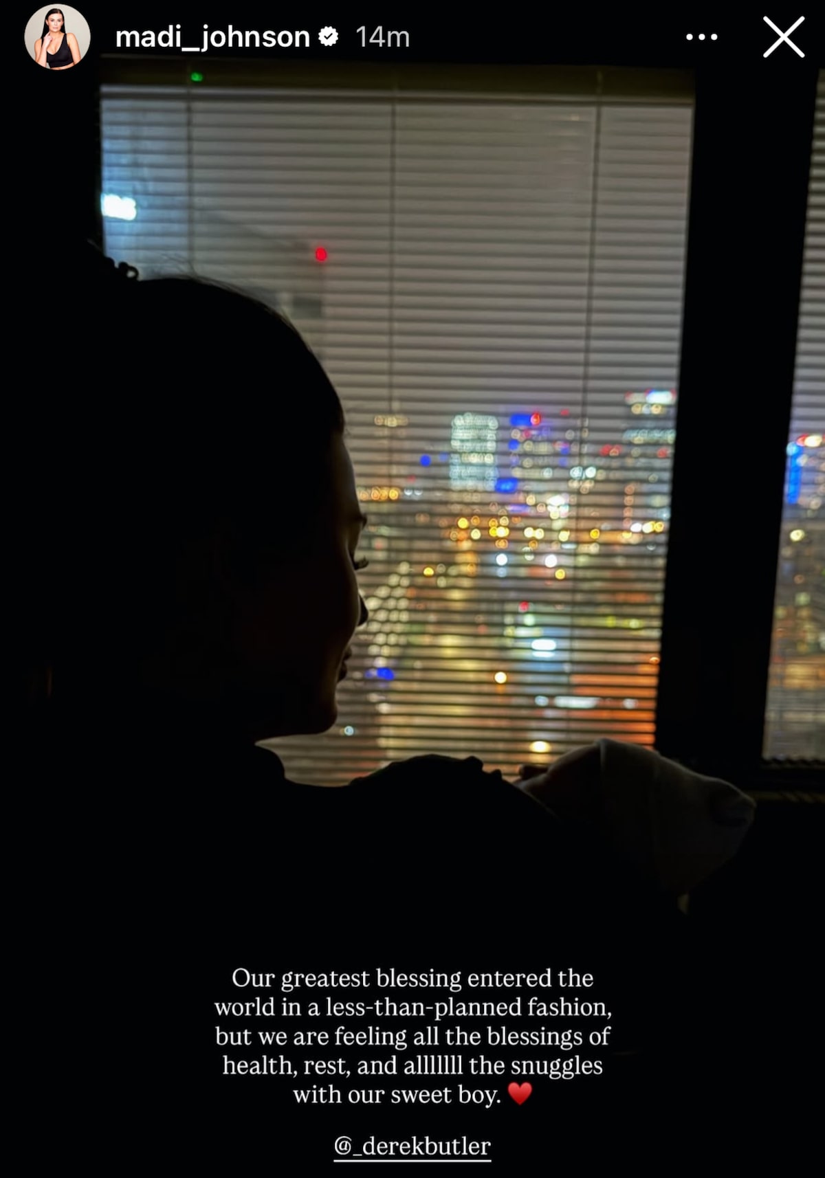 Over a silhouetted picture of Madi holding her baby, she said, “Our greatest blessing entered the world in a less-than-planned fashion, but we are feeling all the blessings of health, rest, and alllll the snuggles with our sweet boy. ♥️”