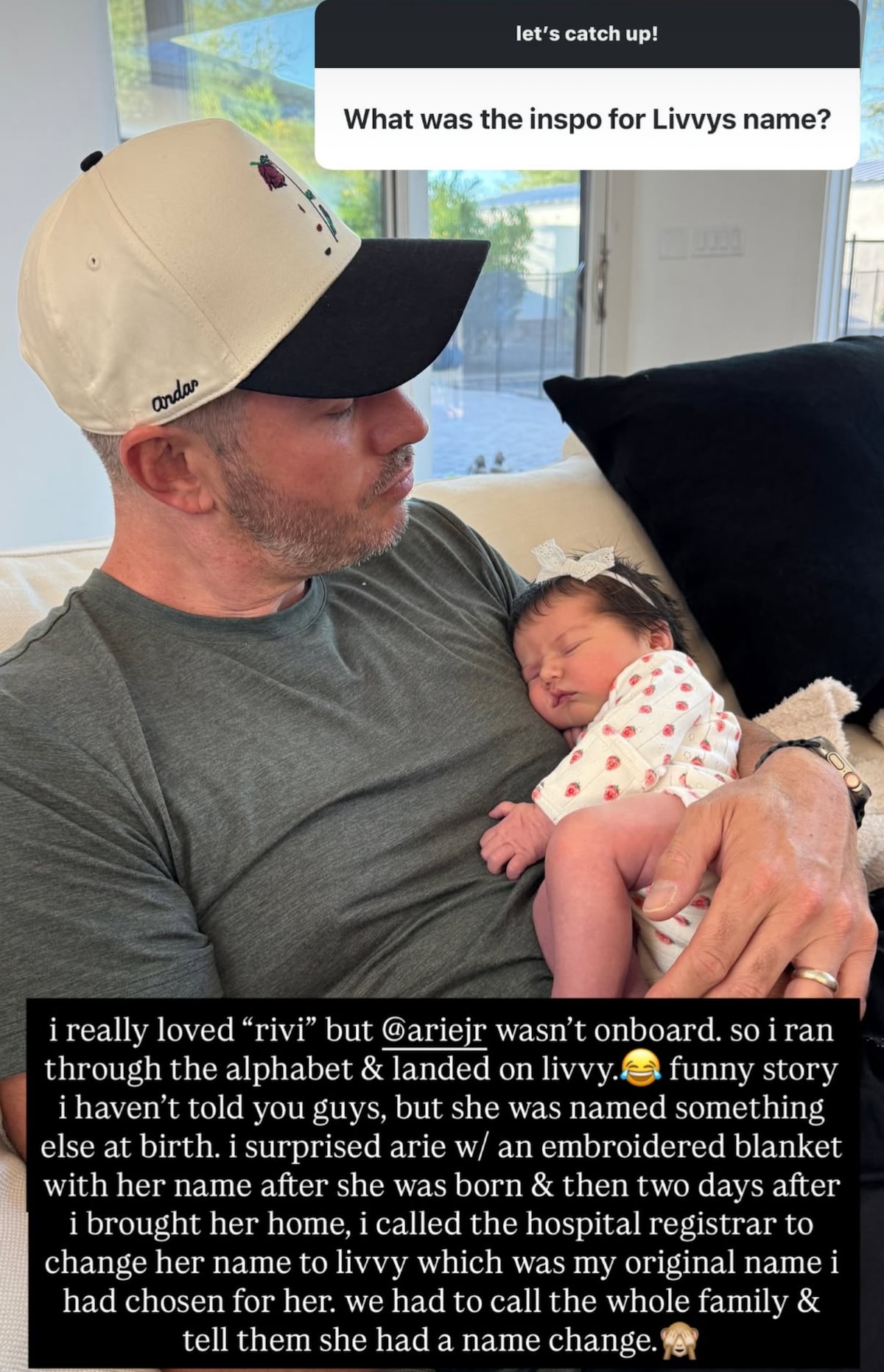 She wrote, “Funny story I haven’t told you guys, but she was named something else at birth. I surprised Arie w/ an embroidered blanket with her name after she was born & then two days after I brought her home, I called the hospital registrar to change her name to Livvy which was my original name I had chosen for her.”