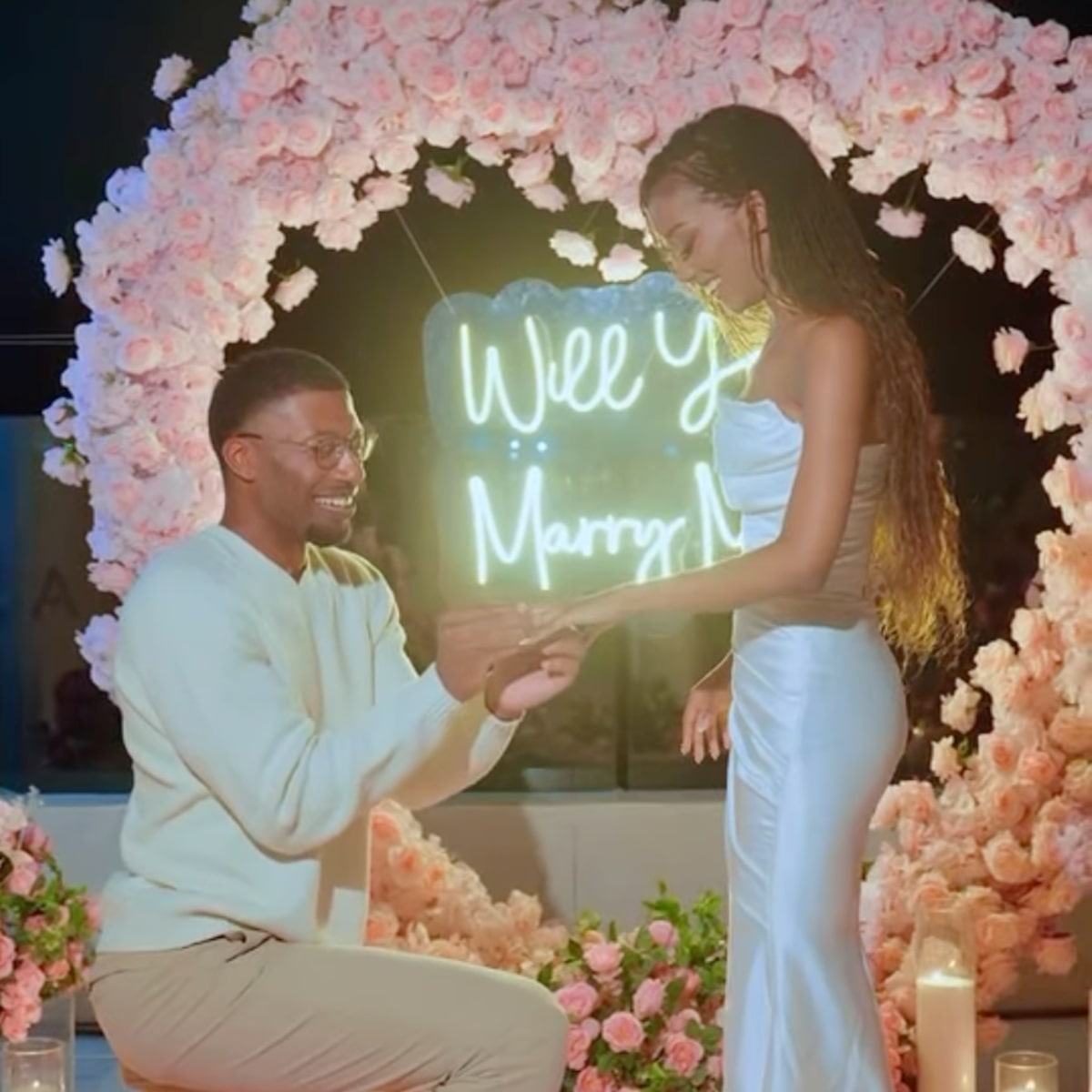 The post shows a video of the stunning proposal, with a giant heart of pink roses outlining a lit-up sign that reads “Will You Marry Me?” while overlooking the water.