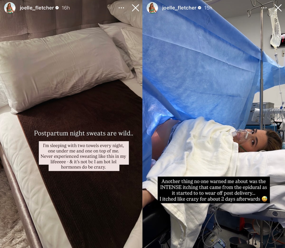 In a series of photos on her Instagram Story, the new mom shared, “Postpartum night sweats are wild… I’m sleeping with two towels every night, one under me and one on top of me. Never experienced sweating like this in my lifeeeee – & it’s not bc I am hot lol hormones do be crazy.”