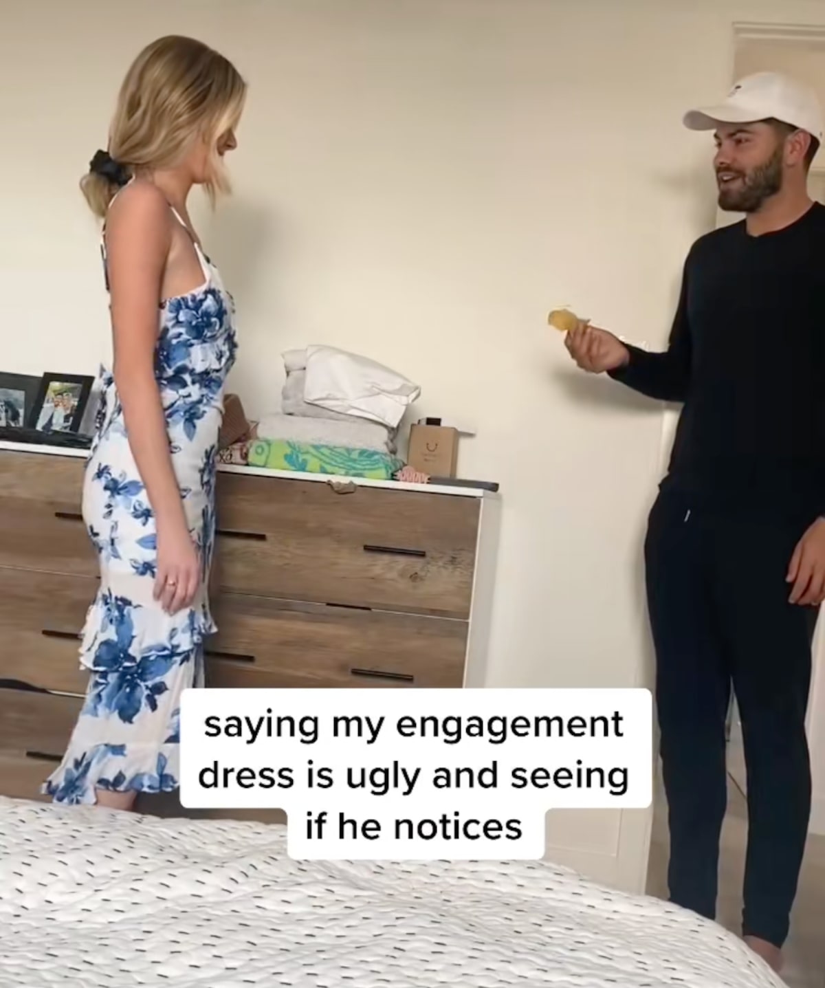 In a new video posted on social media, Hannah wrote, “Saying my engagement dress is ugly and seeing if he notices.”