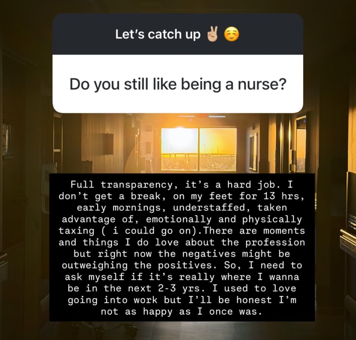 She wrote, “Full transparency, it’s a hard job. I don’t get a break, on my feet for 13 hrs, early mornings, understaffed, taken advantage of, emotionally and physically taxing (I could go on).”