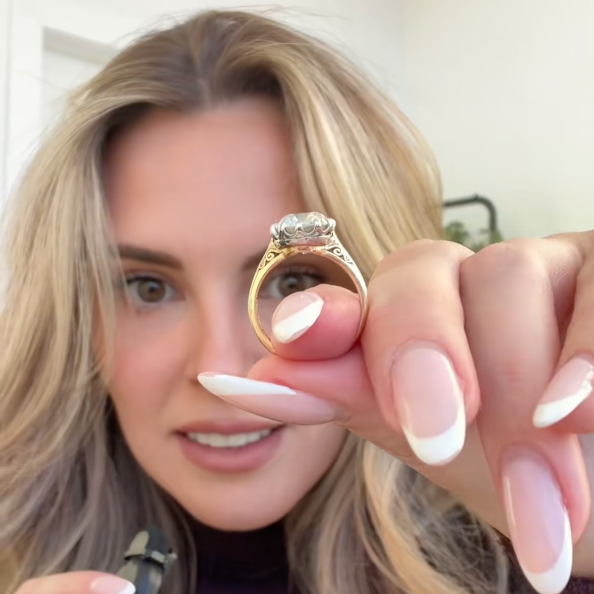 “So the diamond itself is 3.33 carats. Old, she’s a little wonky, she has some bruises. Honestly, I love that,” she said. “She’s got chunky facets. She’s an eye color VS2 clarity. She looks like a round, but she’s technically a cushion cut. She’s not perfectly round.”