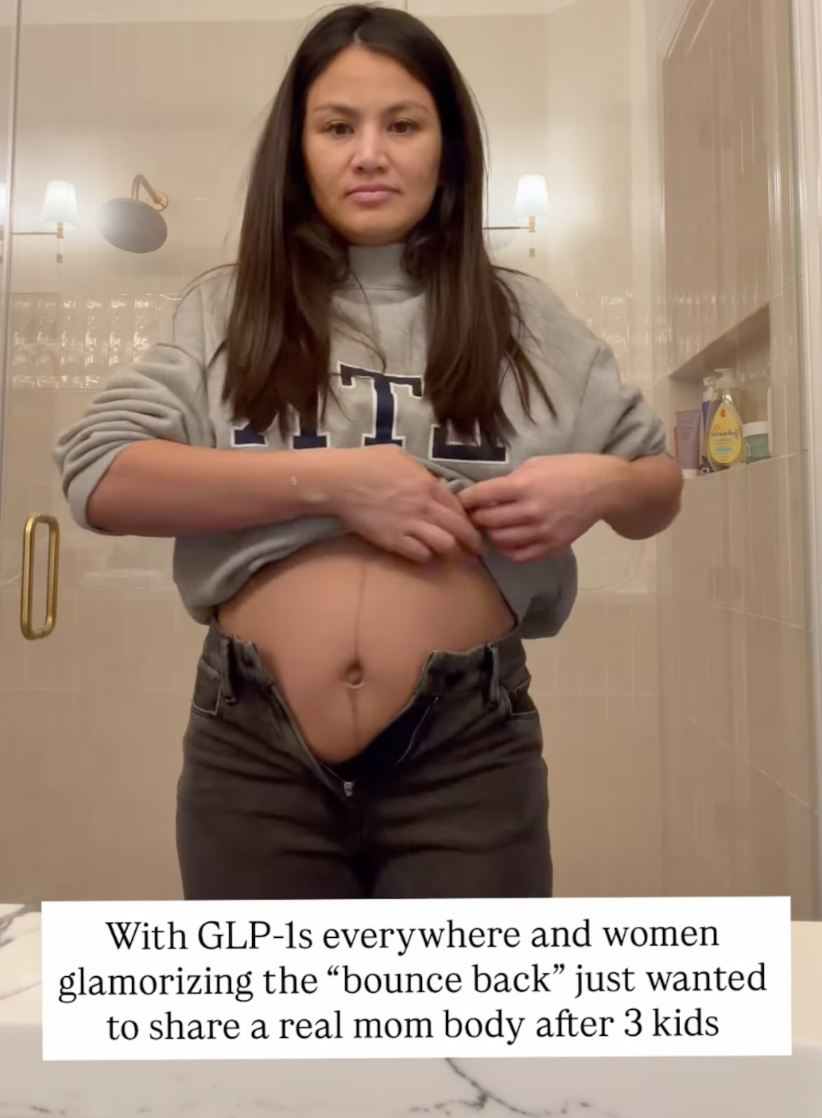 On the video, she wrote, “With GLP-1s everywhere and women glamorizing the ‘bounce back,’ I just wanted to share a real mom body after three kids.”