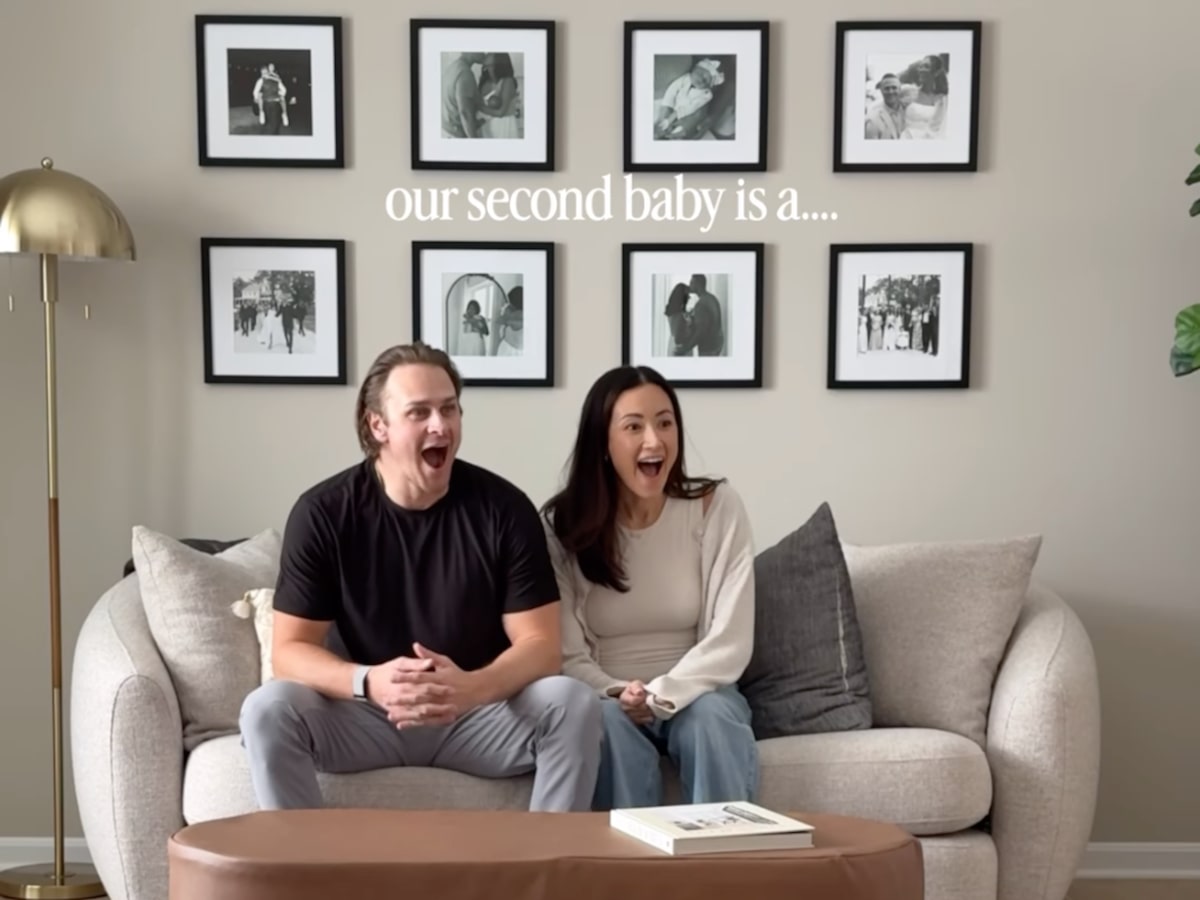 The video then cuts to Nick and Sydney sitting on their couch with the text, “our second baby is a…” before showing Remy walking out wearing a “big sister” sweater and holding pink balloons, revealing it’s a girl.