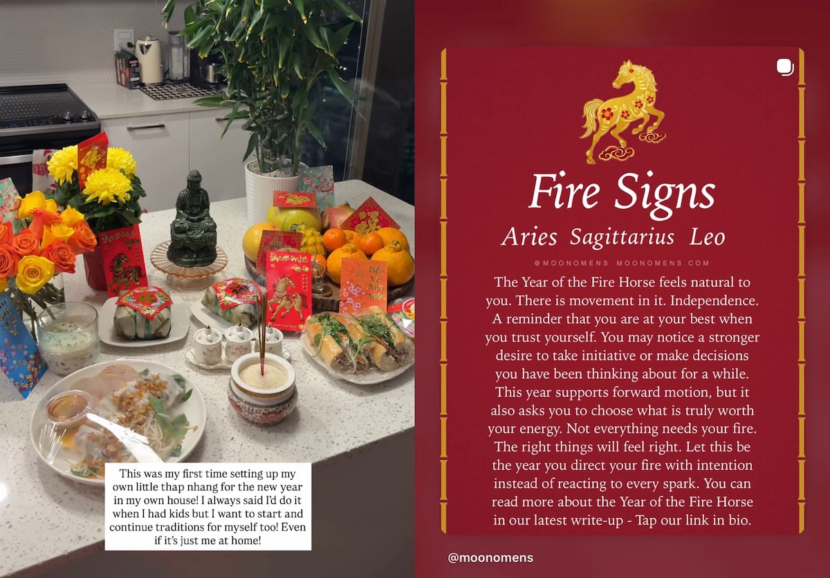 She shared a graphic that read, “The Year of the Fire Horse feels natural to you. There is movement in it. Independence. A reminder that you are at your best when you trust yourself. You may notice a stronger desire to take initiative or make decisions you have been thinking about for a while. This year supports forward motion, but it also asks you to choose what is truly worth your energy. Not everything needs your fire. The right things will feel right.”