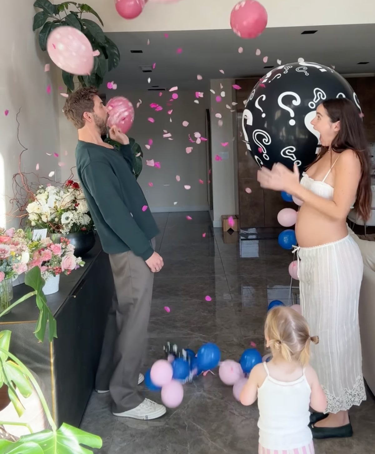 In a new video posted on Instagram, the couple stood with two giant question mark balloons as River stood by their sides.