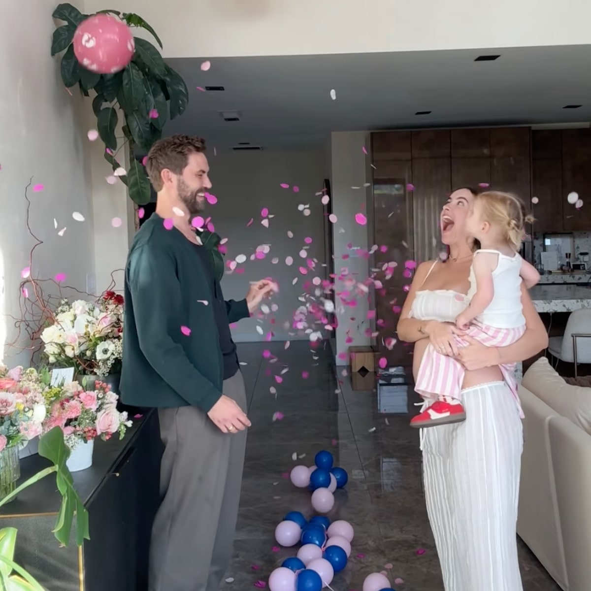 After sharing a sweet kiss, Nick popped the first balloon to reveal pink balloons and confetti, symbolizing that the first baby is a girl.