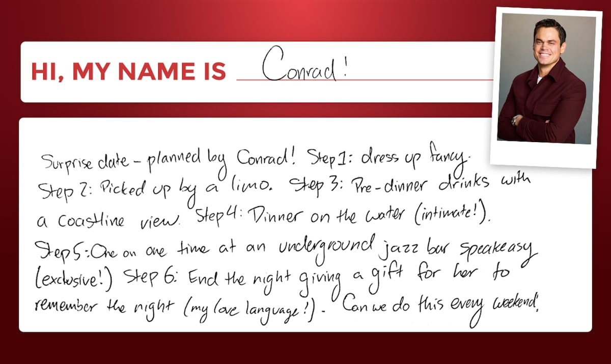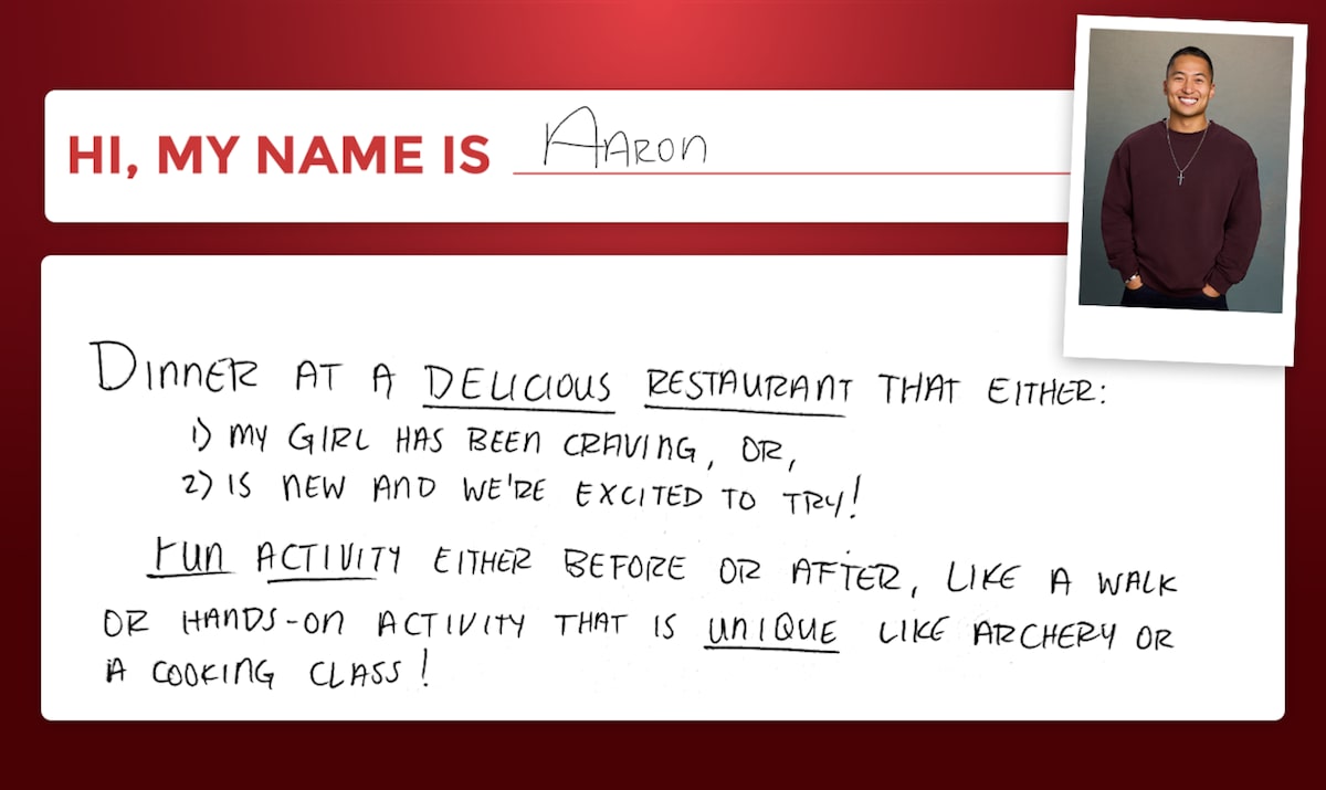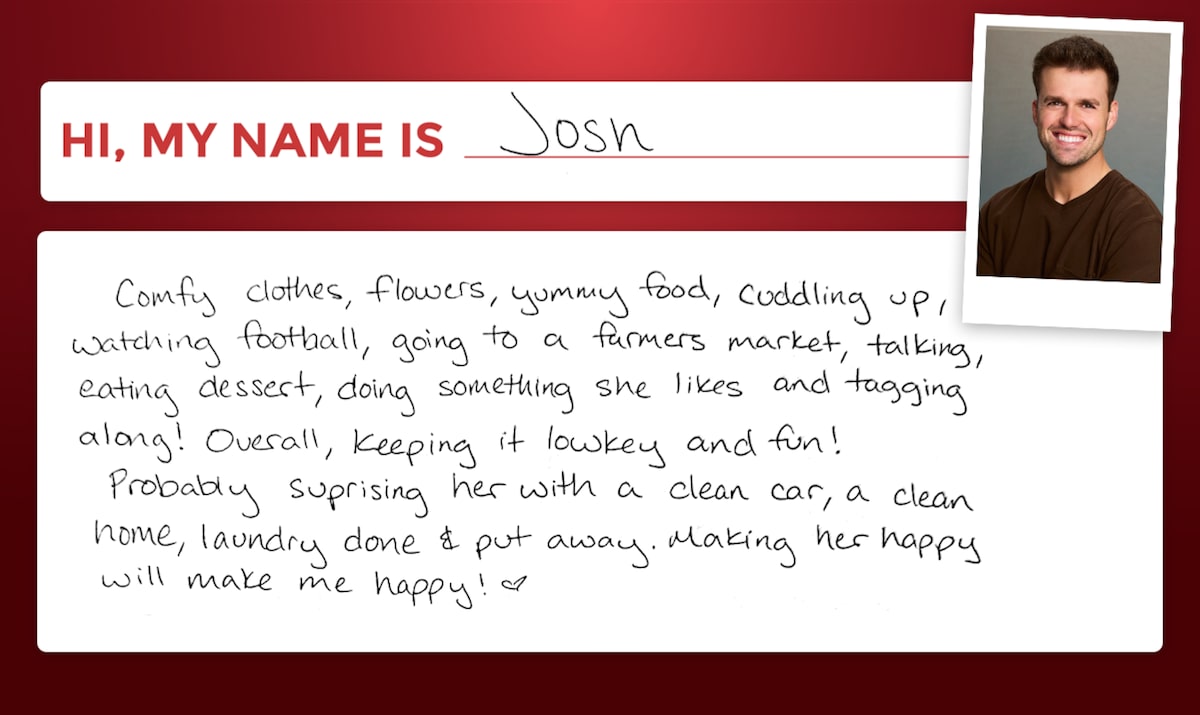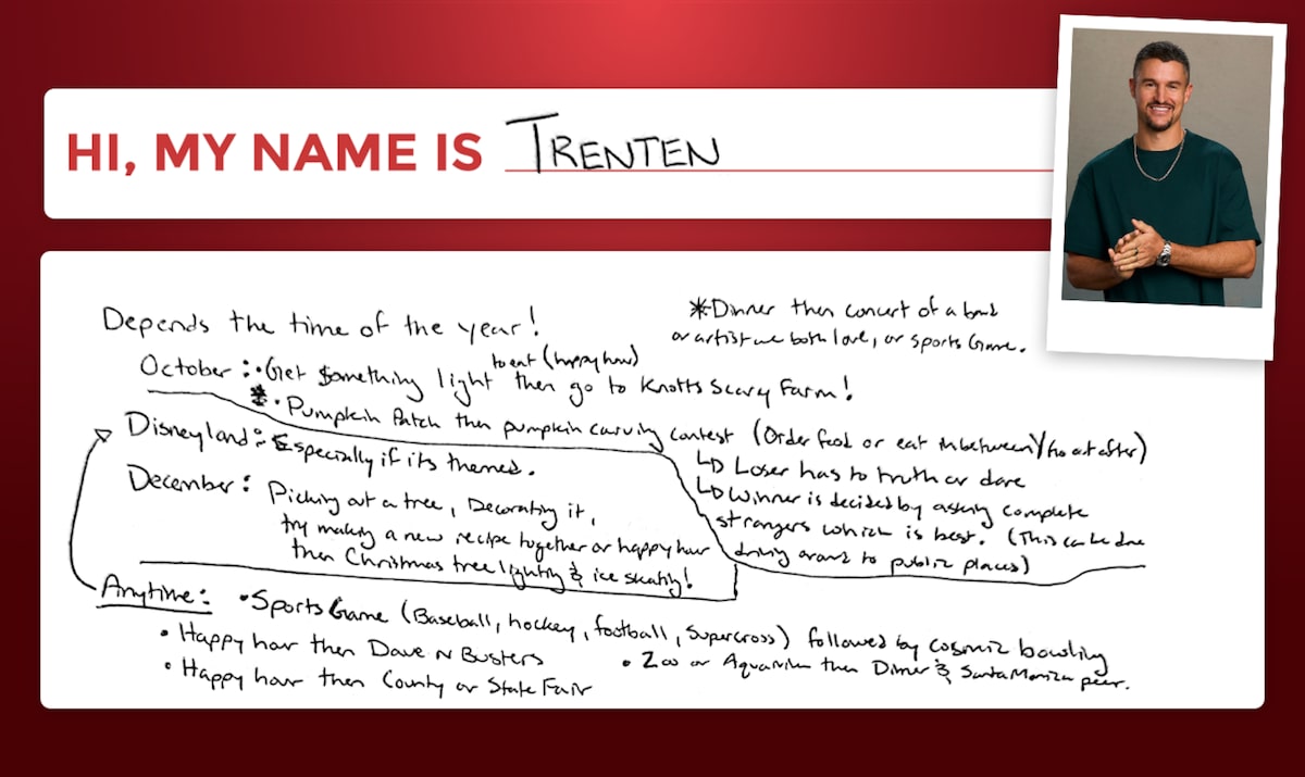 In handwritten notes, contestants Aaron, Conrad, Josh, and Trenten introduce themselves as they respond to the following prompt: “My idea of a perfect date is…”