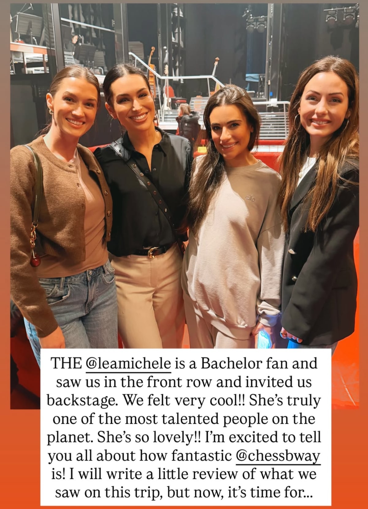 She said, “THE [Lea Michele] is a Bachelor fan and saw us in the front row and invited us backstage. We felt very cool!! She’s truly one of the most talented people on the planet. She’s so lovely!!”