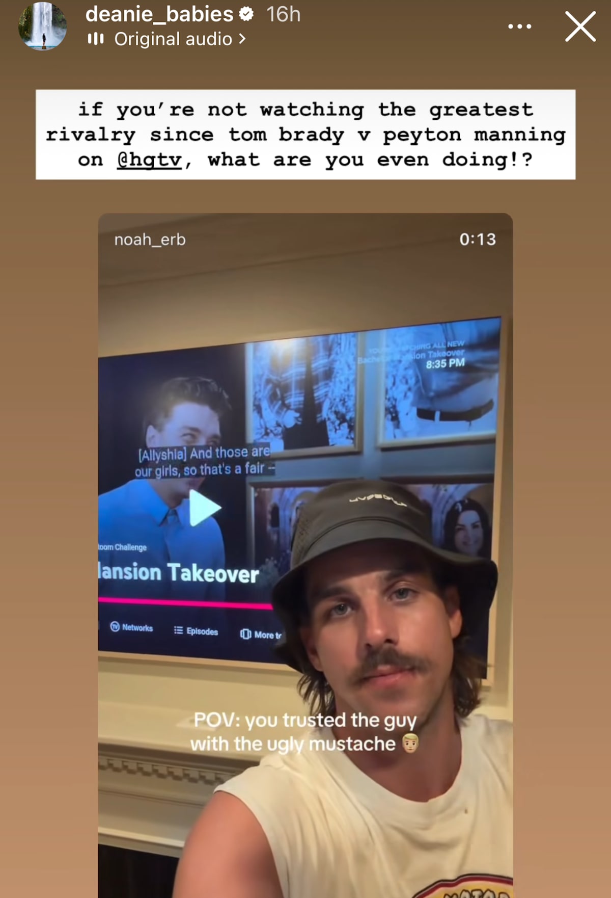 Dean reposted Noah’s video on his own Instagram Story and teased, “If you’re not watching the greatest rivalry since Tom Brady v Peyton Manning on HGTV, what are you even doing!?”