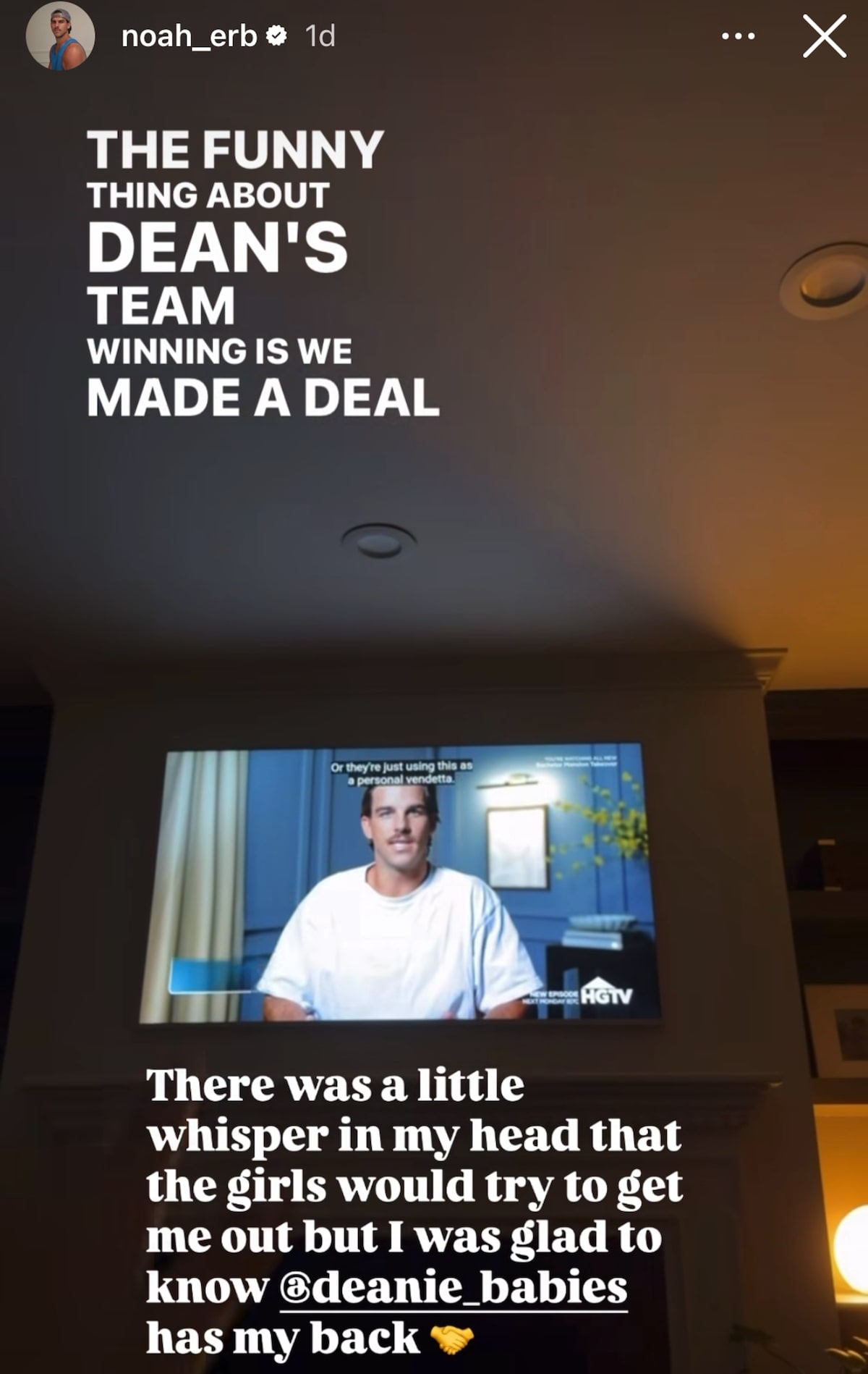 “The funny thing about Dean’s team winning is we made a deal with them that they wouldn’t send us home, we wouldn’t send them home, if either one of us won. So whatever,” he said. “There was a little whisper in my head that the girls would try to get me out but I was glad to know [Dean] has my back 🤝”
