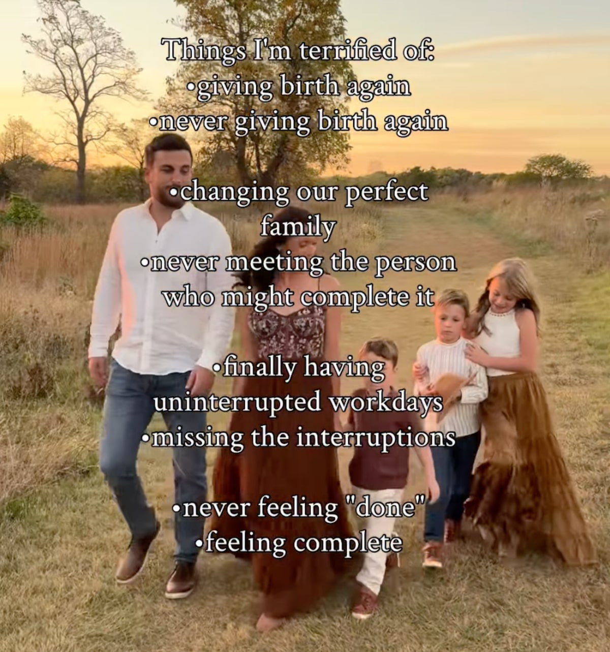 She started off by listing, “giving birth again; never giving birth again” and continued with, “changing our perfect family; never meeting the person who might complete it.”