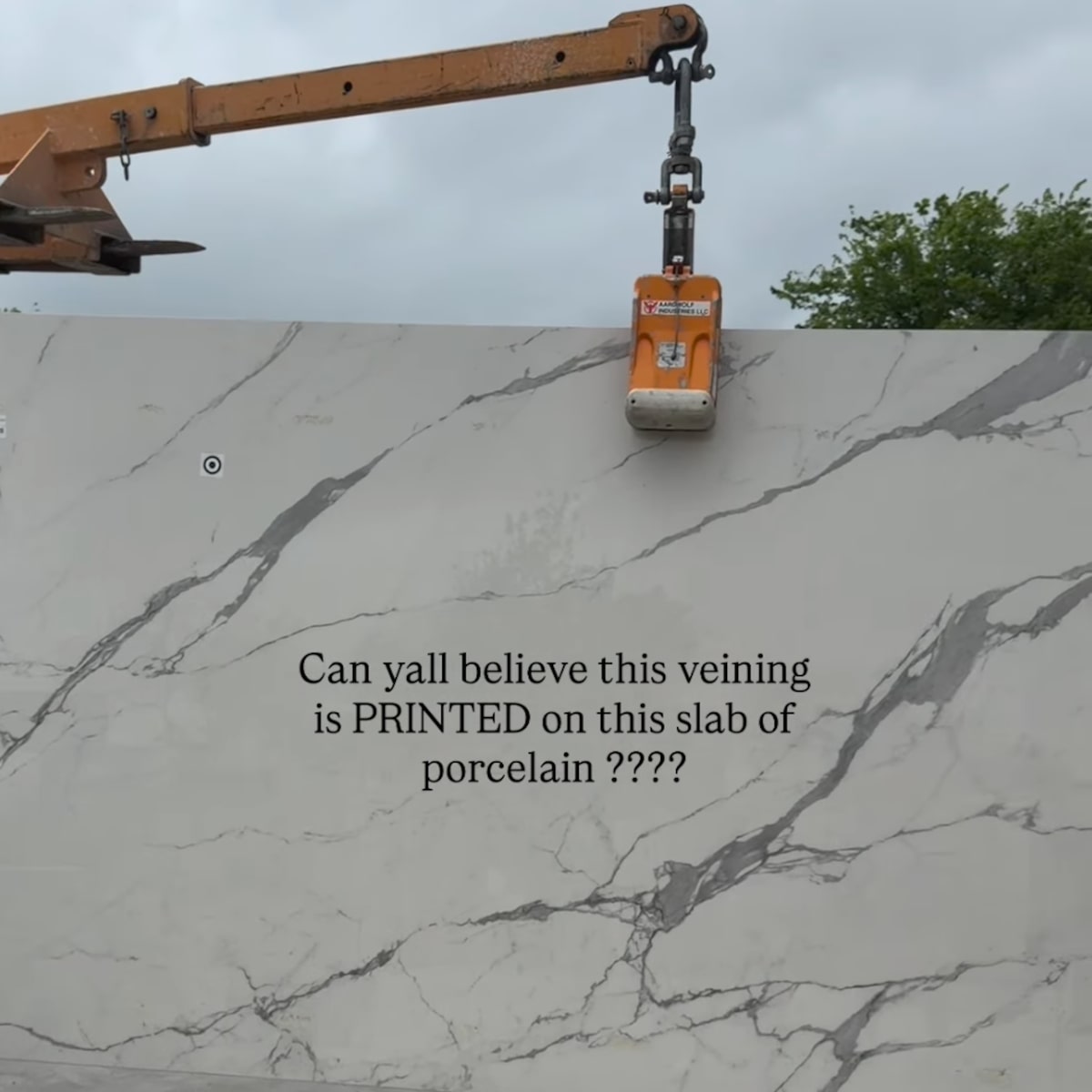 She also gave a sneak peek at one of their beautiful countertops, writing, “Can y’all believe this veining is PRINTED on this slab of porcelain????”